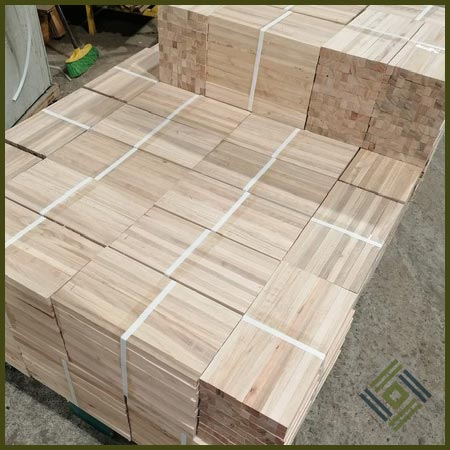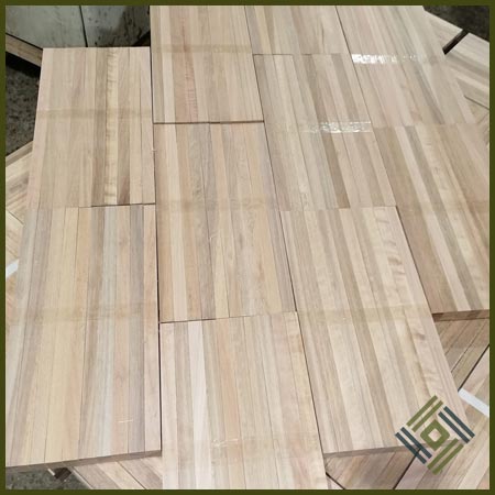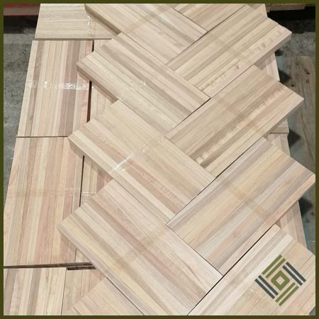 El material se presente en losetas de 300x150 mm. Bajo pedido se puede suministrar de 300x300mm. Los listones de madera maciza de Eucalipto que componen la loseta son de: